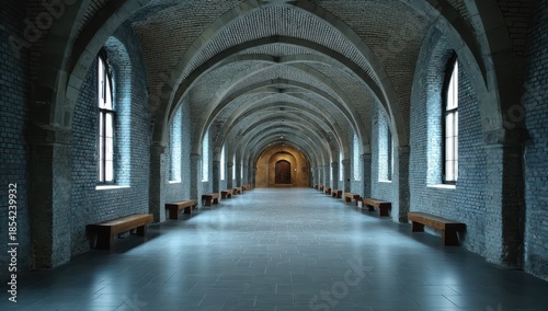 hallway, corridor, vaulted, arch, arched, stone, masonry, wall, ceiling, floor, window, gothic, mediaeval, ancient, historic, historical, building, castle, palace, monastery, cathedral, architecture, interior, structure, grand, majestic, perspective, symmetric, symmetry, leading, line, depth, long, empty, huge, wide, roomy, reflective, light, natural, bright, illuminated, shadow, detail, texture, pattern, repetition, serene, tranquil
