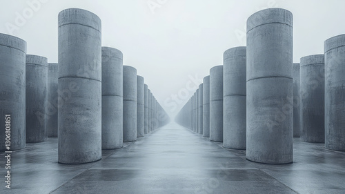 pillar, column, architecture, symmetry, concrete, endless, perspective, repetition, geometric, modern, urban, minimalism, overcast, pathway, structure, design, industrial, space, pattern, uniformity, surreal, abstract, alignment, vanish, calm