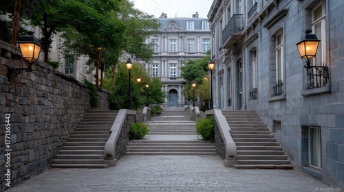 staircase, architecture, symmetry, grand, stone, step, building, ornate, street light, lighting, evening, light, path, paseo, exterior, facades, classic, historic, urban, city, travel, destination, natural light, ambient, serene, peaceful, elegant, formal, residential, structure, design, garden, greenery, plant, tree, stone wall, cobbled