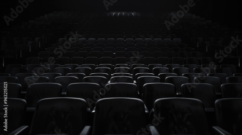Symmetrical view of empty black theater seats on an indoor stage, focusing on drama and performance.