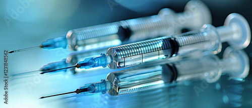 Syringes filled with liquid displayed on a reflective surface in a medical setting during the afternoon
