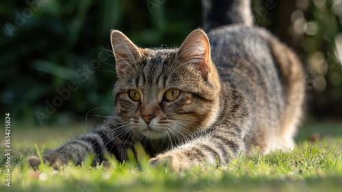 Tabby cat is stretching in grass, looking relaxed and content. sunlight highlights its fur, creating warm and peaceful atmosphere in garden setting
