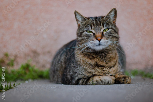 cat, tabby, grey, lying, domestic, pet, looking, eye, green, comfortable, mammal, beautiful, resting, relaxing, cute, animal, fur, gentle, grey, laziness, day, outdoors, paw, female, wall, concrete, asphalt, ground, no one, nobody, horizontal, 1, 1, grass
