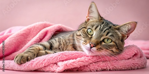 Tabby Cat Resting on a Pink Blanket, Close-up Portrait, Furry Texture, Sleepy Pet, Cat Napping, Pink Background, Cat
