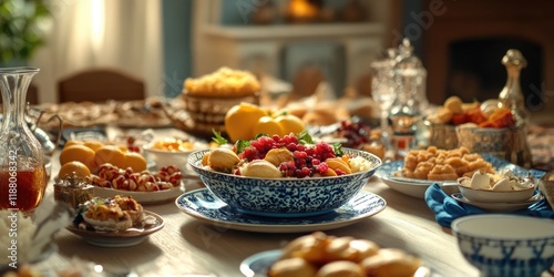 Table is set with a variety of food, including a blue bowl of fruit. The table is set for a large gathering, and the mood is festive and inviting