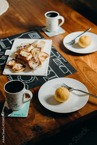 Table setting for breakfast - Plate, fork, cup and toast on the wooden table.