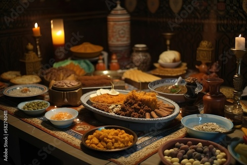 table, setting, ramadan, food, generative, ai, islamic, culture, tradition, dinner, meal, feast, hospitality, middle east, arabic, cookery, delicious, appetising, satisfying, healthy, alimentary, fasting, date, sweet, dessert, tea, hot drink, water, plate, bowl, cup, cutlery, decor, ornate, colourful, festive, joyful, harmony, comfort, relaxation, seating, cushion, floor, carpet, artistic, dining
