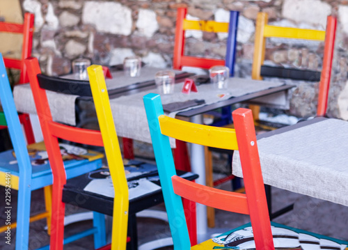 Tables with multi-colored chairs on the terrace in a cafe in Taormina, Sicily, Italy