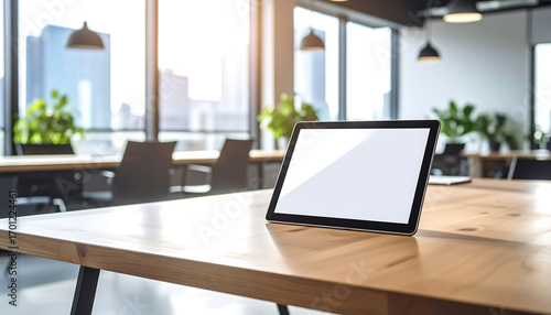Tablet on Wooden Table in Bright Modern Office