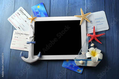 Tablet with credit cards and flight tickets for vacation on blue wooden table