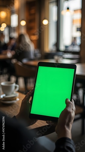 Tablet with Green Screen Display in Cafe Scene
