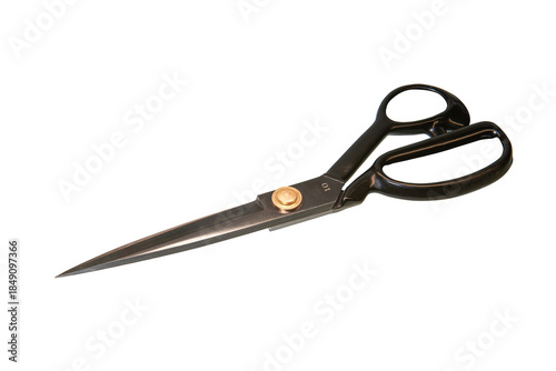 Tailor scissors isolated on white background, sharp metal cutting tool for sewing, tailoring, fabric work and craft projects, professional garment equipment with classic black handles