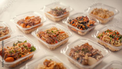 Takeout meal bowls with assorted Asian noodles, vegetables and grilled protein, appetizing