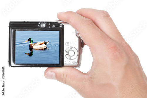 animal, camera, compact, digital, duck, hand, lake, anas platyrhynchos, motive, nature, photo, photographer, photo, snapshot, viewfinder