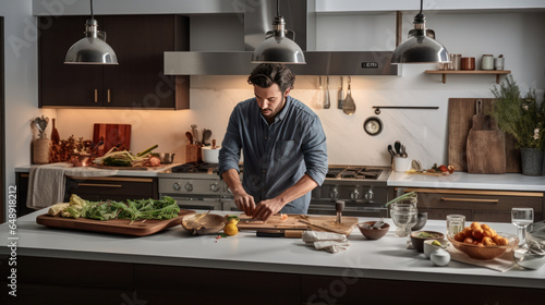 Talented chef passionately prepares exquisite dishes in a bustling kitchen.