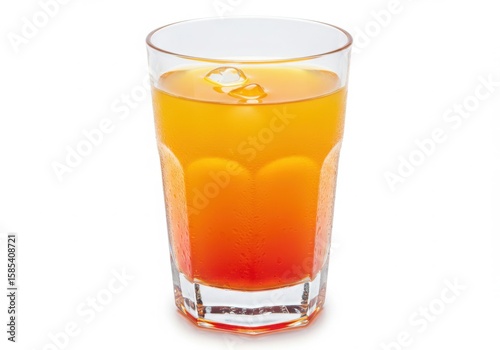 Tall glass filled with refreshing orange and red layered juice with ice cubes isolated on white background