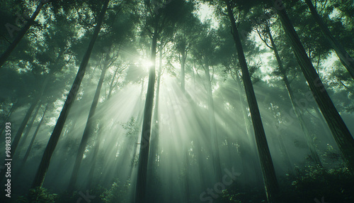 Tall, misty trees with sunlight streaming through the branches, creating a magical and mysterious forest atmosphere