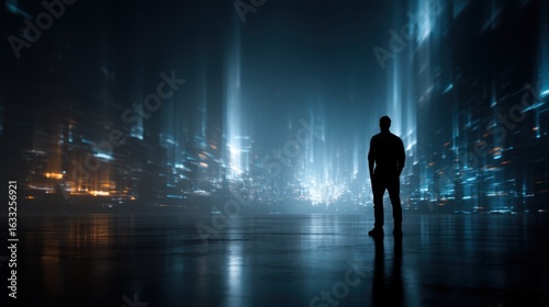 programmer, standing, tall, room, glowing, screen, technology, digital, silhouette, futuristic, artificial, intelligence, design, creative, abstract, innovation, light, dark, brightness, optical, space, atmosphere, clarity, concept, modern, environment, professional, work, inspiration, science, datum, visualisation, coding, information technology, software, developer, night, ambient, projection, dynamic, perspective, contrast, motion, exploration