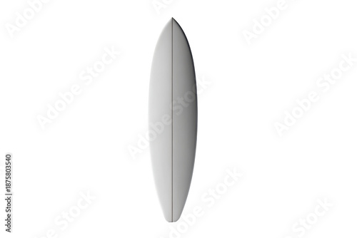 Tall surfboard standing upright with a long narrow shape, rounded nose, smooth fiberglass contours, and subtle fin-area detailing isolated on transparent background.