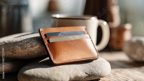 leather, card, holder, billfold, brown, tan, stone, rock, mug, hot drink, close, up, simple, minimalist, craft, hand-made, small, compact, design, accessory, practical, modern, natural, rustic, organic, detail, stitching, product, display, gentle, sunlight, wooden, surface, background, blurred, sharpened, high, quality, gift, stylish, functional