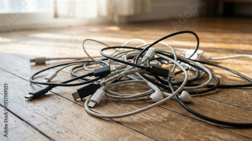 tangled, cable, floor, white, black, texture, light, indoor, messy, clutter, cord, wire, organisation, technology, home, sunlight, room, equipment, lifestyle, modern, electronic, device, disarray, wooden, background, detail, chaos, pattern, resting, closeup, disposable, usb, earphones, connector, electric, utility, confusion, cluttered, space, idled, basic, workspace, connectivity, accessory, communication, connection, distraction, relaxation