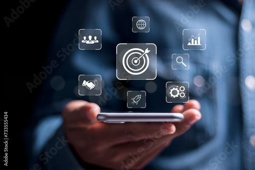 Targeting business concept. Person use smartphone with virtual target icon for strategic planning to business growth and target customer group. business objective.