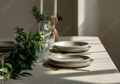 table, setting, elegant, dining, plate, cutlery, greenery, centrepiece, sophisticated, minimalist, modern, stylish, design, decoration, event, celebration, party, wedding, reception, dinner, lunch, meal, eatery, catering, hospitality, home, decor, interior, lifestyle, aesthetic, ambience, still, life, tableware, gold, grey, green, natural, organic, simple, clean, contemporary, luxury, fine, special, occasion, festive, arrangement, place