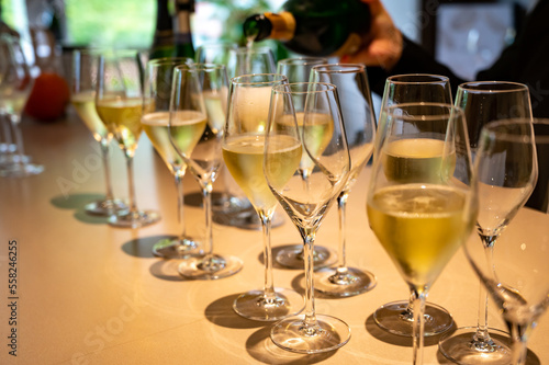 Tasting of brut and reserve champagne sparkling wine produced by traditional method in underground caves in Champagne, France