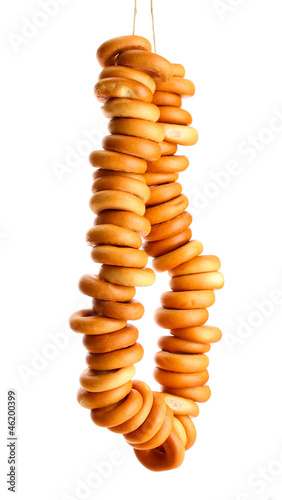 tasty bagels on rope, isolated on white