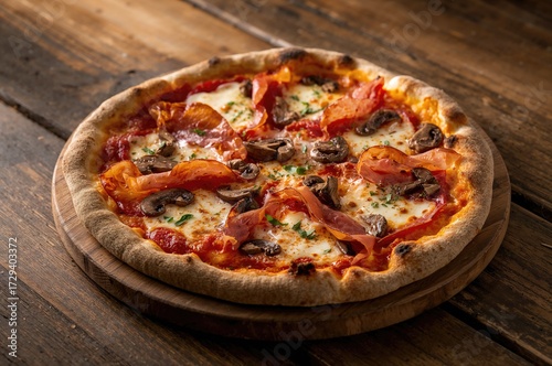 Tasty Capricciosa Pie Topped with Ham, Cheese, and Mushrooms on a Rustic Wooden Surface