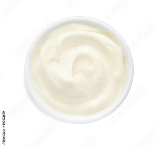 Tasty fresh mayonnaise sauce in bowl isolated on white, top view
