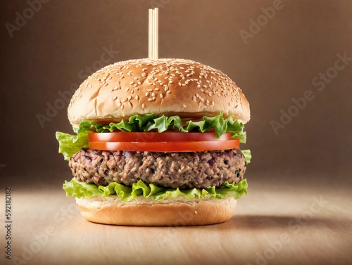Tasty hamburger with lettuce and tomato on wooden table, closeup.