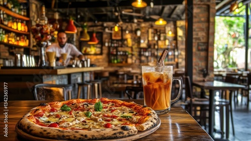 pizza, eatery, food, drink, ice, tea, italian, cookery, delicious, meal, dinner, lunch, wooden, table, rustic, interior, bar, warm, lighting, pub, cafes, brown, cheese, tomatoes, basil, pepperoni, mozzarella, tasty, appetising, epicure, gastronomy, culinary, eat, eating, fresh, photo, setting, casual attire, dining, evening, night, indoor, glasses, straw, decor, cosy