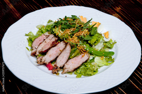 Tasty satat. Ingredients mixed salad, mini potatoes, asparagus, egg, bulgarian pepper, pork cut, mustard filling