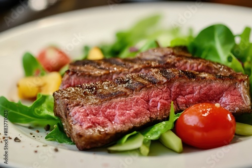 salad, steak, food, kitchen, white, eatery, green, meat, asian, siam, tomatoes, plate, vegetable, spice, cherry, bar-b-q, dinner, meal, cookery, epicure, lunch, dish, herb, sauce, pepper, grilled, roasted, fried, onion, beef, lettuce, roast, spicey, chili, fillet, slice, thai, closeup, cut, delicious, eat, filet, hot, piece, prepared, top, view