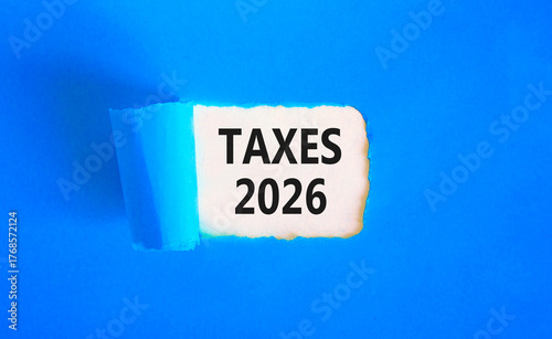 Taxes 2026 new year symbol. Concept words Taxes 2026 on beautiful blue paper. Beautiful yellow paper background. Business and taxes 2026 new year concept. Copy space.