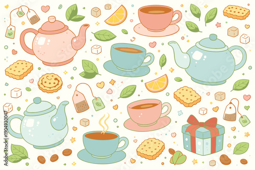 beverage, tea, symbol, illustration, drawing, bow, icon, design, vector, present, refresh, white, texture, cup, drink, pink, cute, lemon, break, art, teapot, afternoon, hot, blue, food, star, mug, sugar, biscuit, leaf, slice, treat, background, yellow, cube, orange, nubes, warm, cookie, gift, kitchen, relax, simple, green, cartoon, flat