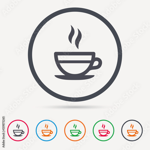 Tea cup icon. Hot coffee drink symbol. Round circle buttons. Colored flat web icons. Vector