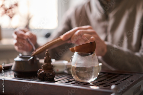 Tea master pours white tea to guests. Everything is ready for the tea ceremony. The ceremony is according to all the rules, but not in the classical style. Adapted to a modern apartment.