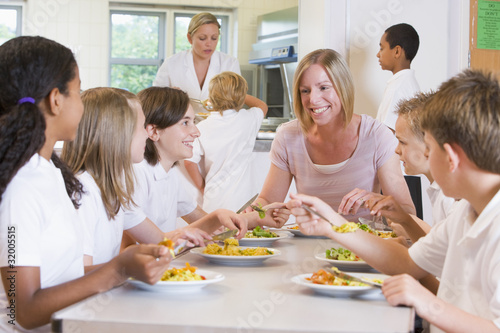 Teacher and schoolchildren enjoying their lunch in a school cafe