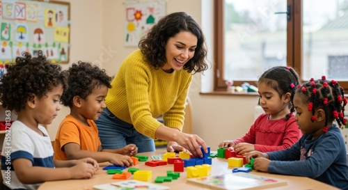 preschool, children, teacher, learning, education, classroom, activity, play, toy, colourful, diversity, group, student, children, kindergartner, support, assistance, interaction, daytime, indoor, table, teaching, engagement, positive, happy, bright, cheerful, building blocks, shape, primary, copy space, image, photo