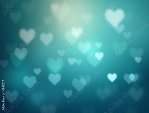 Teal background with soft glowing heart shapes in bokeh effect. Abstract romantic design with a dreamy and blurred atmosphere