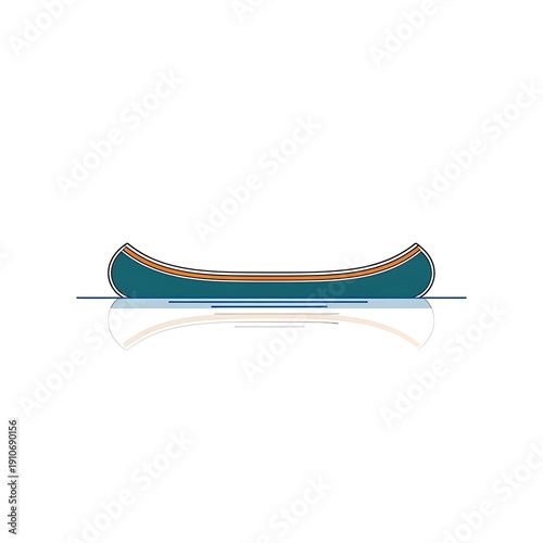 Teal canoe with orange stripe floating on calm water with reflection