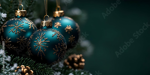 Teal Christmas Ornaments Decorate Tree with Gold Snowflake Design