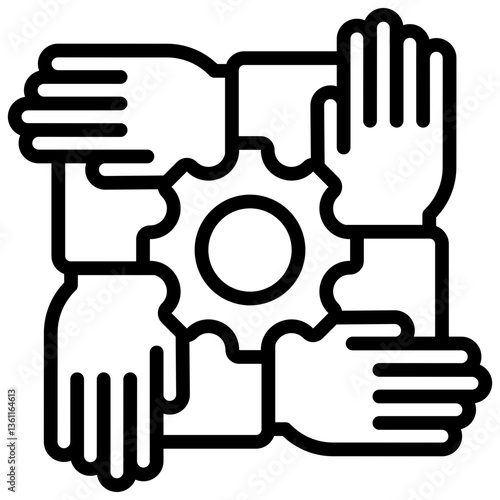 team, collaboration, gear, hand, together, trust, engagement, communication, adaptability, innovation, fulfillment, icon, line, symbol, outline, illustration
