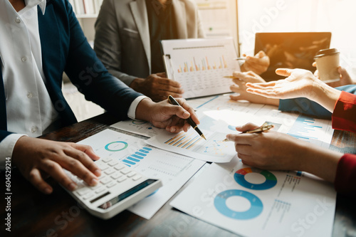 Team business meeting presentation. Hand businessman working project in modern office.Laptop computer and tablet and smart phone on white desk