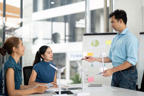 Team Collaboration on Sustainability. Discussing renewable energy projects in a modern office.