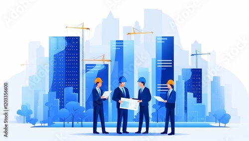 architect, construction, city, plan, blueprint, teamwork, building, skyscraper, project, design, meeting, development, modern, urban, architecture, planning, collaboration, strategy, progress, future, growth, innovation, technology, success, efficiency, infrastructure, industry, business, professional, men at work, blueprint, crane, city landscape, illustration, vector, graphic, concept, style