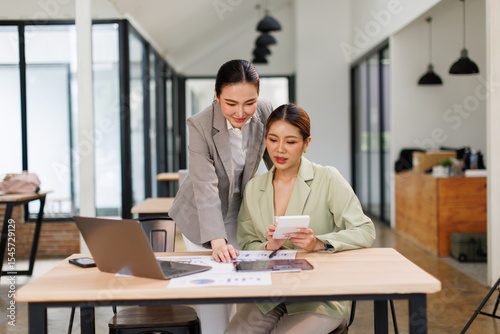 Team of business partnership use calculator to calculate coworkers analysis strategy with discussing a financial planning graph and company budget during a budget meeting in office.