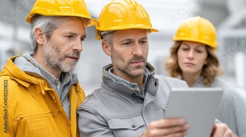 Team of engineers collaborating on a project in a construction site, using a tablet for planning and communication.
